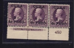 Scott: 224 ($110.00) Unused strip of three with plate number 450. Unused never hinged with original gum.