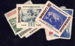 Lot #301 | Year: 1956 Scott: 559, C149 ($70.00) Two bottom strips of six pf each of the stamps of this issue. Unused light hinge and original gum. Additionally a First Day Cover is included. |