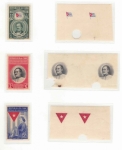 Lot #544 | Year: 1951 Scott: 458-460, C41-43, E13 Vignette proof of flag issue. Each with large hole punched. |