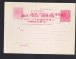 Edifil: 52 var 1c green, "ULTRAMAR" overprint in blue, entire with fair strike of the overprint, pristine condition. Very fine and very scarce, the "ULTRAMAR" specimen overprint was applied by Portuguese postal authorities on items received from the U.P.U. and before distribution to their colonial post offices. U9 var.