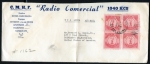 Scott: 431 Block of four on Radio Comercial envelope. Shortened on top and creased down the middle.