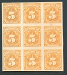 Lot #539 | Year: 1914 Scott: J5-7 PROOF BLOCK OF NINE on heavy card stock. Unissued color. |