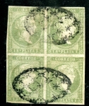 Lot #80 | Year: 1860 Scott: 15 ($100.00) Edifil: 10c (190.00€) Y 1/4 OVERPRINT Type C. Position 13B. Used with hinge mark. |