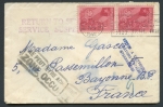 Scott: 362 Pair on WORLD WAR II cover to occupied France. Returned as service suspended. German censor mark.