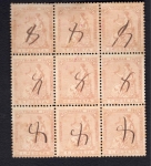Lot #93 | Year: 1871 Scott: 53 ($270.00) Block of nine pen cancelled. Well centered and in good condition. |