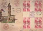 Scott: 432 First Day Cover with the Centro de Hoja of 16 stamps. Signed by the Minister of Communications and Auxiliary Director. Morro design made of pieces of Cuban stamps. A beautiful work of art.