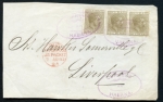 Lot #192 | Year: 1882 Scott: 104 Strip of three on front to England. Liverpool US Packet marking. |