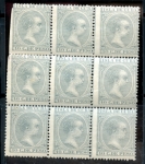 Scott: 149 ($9.00) 10c emerald block of 9. Unused with one stamp hinged and origianl gum.