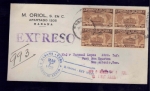 Scott: 288 Express Mail cover dispatched March 17, 1928 to Fort Sam Houston via Habana-Key West airmail route. Bears auxiliary marking "Fee Claimed by Office on First Address", franked with a block of 10 cent Pan American Conference stamps. Arrival backstamp on reverse.